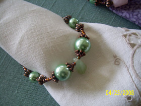 The jeweled napkin rings were made almost the same way I explained the jewelry, except in this case I used memory wire and decorative wrapping wire. These wires don't need to be crimped at the end. Instead, you merely twist the ends with the pliers. In the case of the smaller rings made from the decorative wire, measure 8 -9 inches, depending on your size preference, turn one end into a little ring. string beads on your wire. Slip final end into the loop that you twisted at the first, and twist another loop, and you are done. Enjoy the decorating.