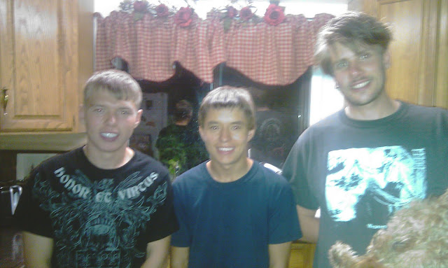 Been having a lovely batch of boys through the house for the past several weeks. As I mentioned before, Nathan and his film crew were here. Most of them stayed up at our little mobile home, we call it "The Cottage". We had worked to get everything in order for them before they got here. Steve had to re-do almost all of the plumbing, which was a long and drawn out frustration, but needed to be done, and this gave incentive to put it into overdrive. It was up and running by the time they got here. We had a great time, and I had a feeling of the "old days" when all the other kids were home and all their friends were in and out of the house. I loved having them around. Eddie thinks its the "cat's meow" when the big guys are all home... particularly with all their friends in tow, and all of them taking him target practicing and off on one of their exploratory trips, really makes life bearable for him. He was in rare form. We all watched a movie together on Thursday night (a film makers assignment). It was a movie about Ghengis Khan... so you can imagine there was a little blood. Eddie informed me that it probably wasn't a movie I should watch. I got a great chuckle out of that.