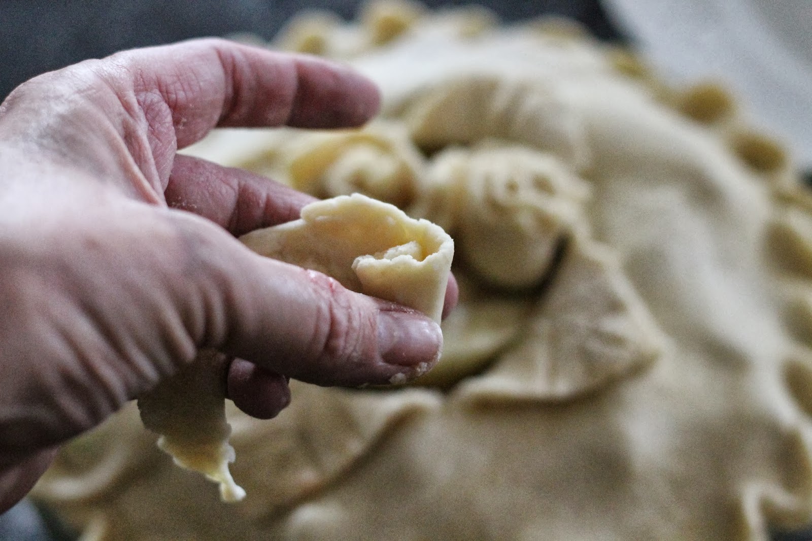 Place your top crust onto the pie and crimp together with the bottom crust.  Make an X in the top of your crust and peel it open.  They will become leaves.   Once they are turned back, put leaf lines in them with a knife.  You can see this below... although  I didn't get a close up of me doing this step... sorry; next pie I might add it in.