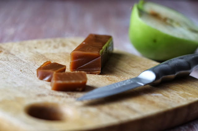 Cut caramels into chunks (these were homemade but you can buy them and do the same).