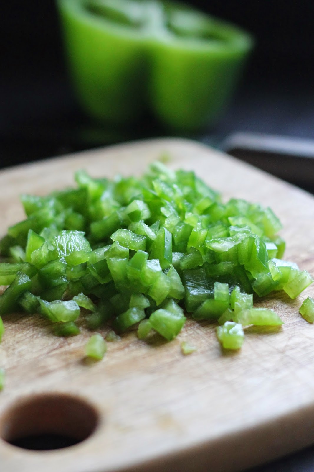 Finely chop green peppers, onion and celery and place into a large skillet where you have melted 1/3 cup of butter.