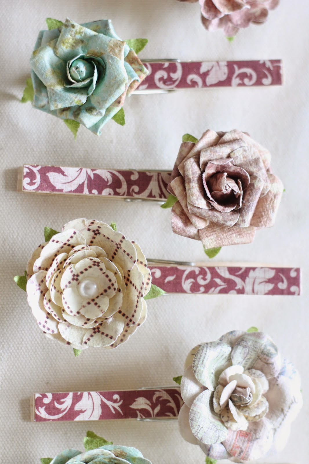 I'm having fun with clothespins again.  I might be getting addicted to decorating these ordinary little items. Last year about this time, I used clothespins to make some airplanes for Valentines Day;  I think it gave me a "thing" for clothespins, because I keep finding myself in the craft store looking at them and mulling over ideas of what to do with them.   So now I am decorating them with pretty scrapbook paper, Mod Podge and flowers. Here's a list of ideas that you can use them for: