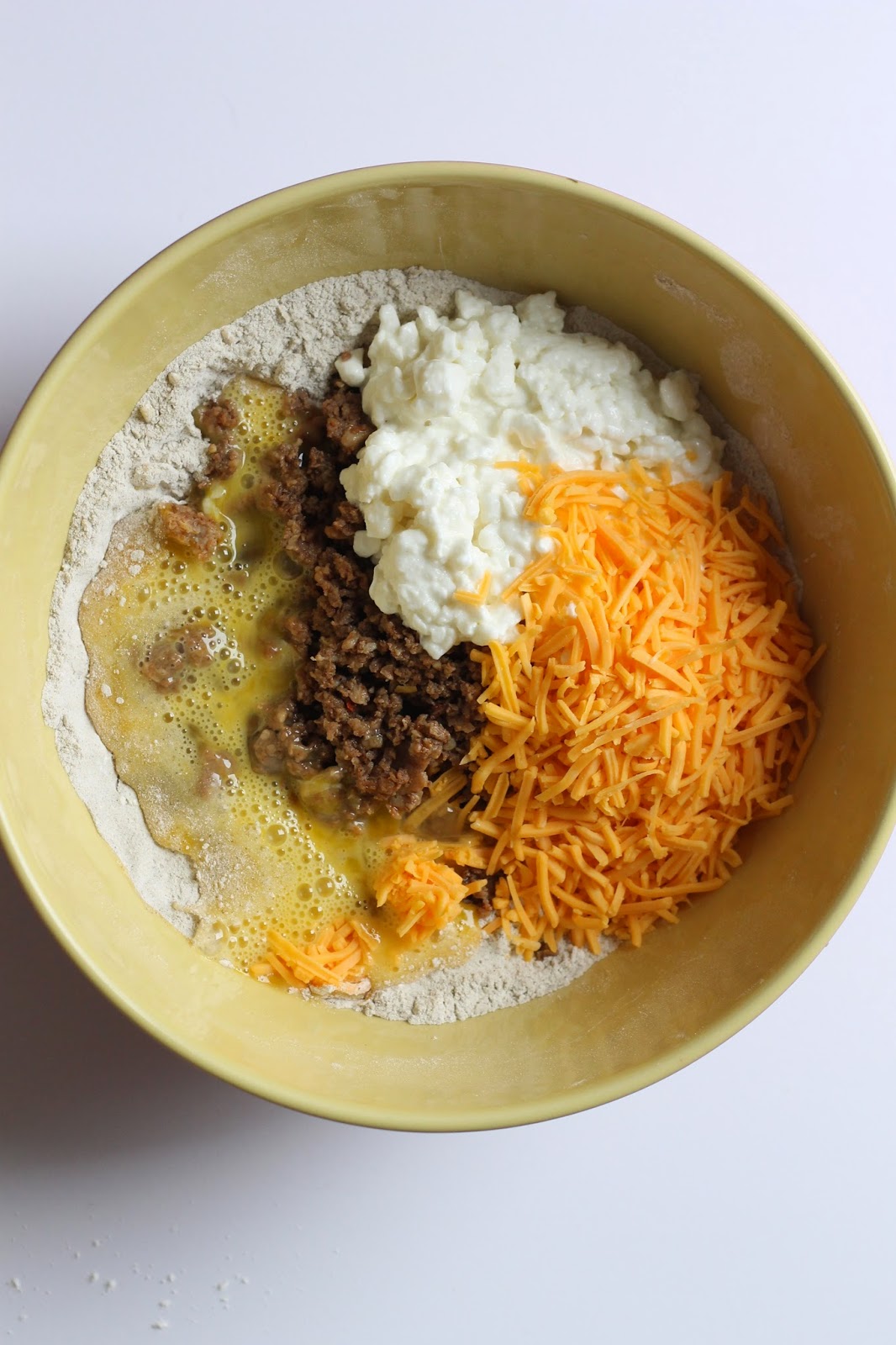 4. Add cooked sausage, cottage cheese and cheddar cheese and eggs; stir well into flour mixture.