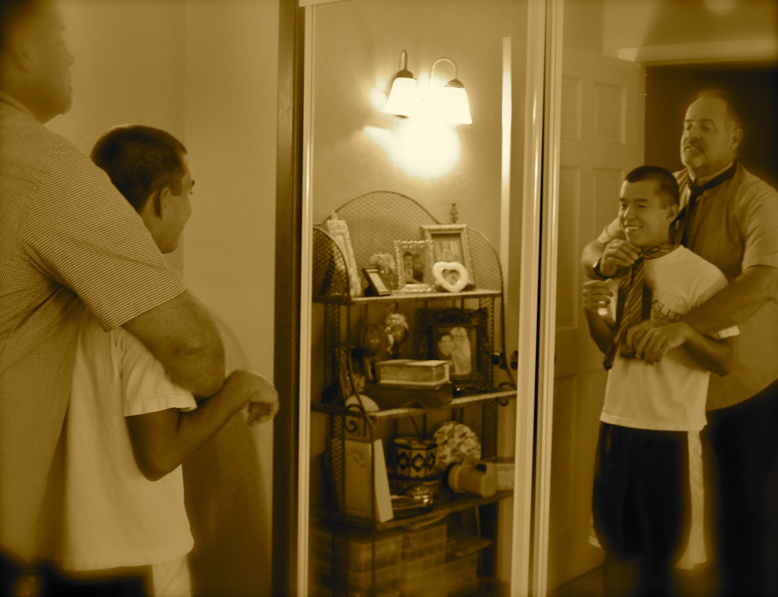 So now, Eddie has had his first lesson in tying a tie... "the bunny goes around the tree and into the hole..." or something like that. Do you think he will remember? Hopefully, but don't hold your breath. I still can't do it after all these years, and I have tried to remember it so I could show the boys when they need help... oh well. I guess that will remain Steve's job. As an additional note, Eddie has worn the clip on ties before for special things, but said this year "no clip on"; and so we did the tie tying class.