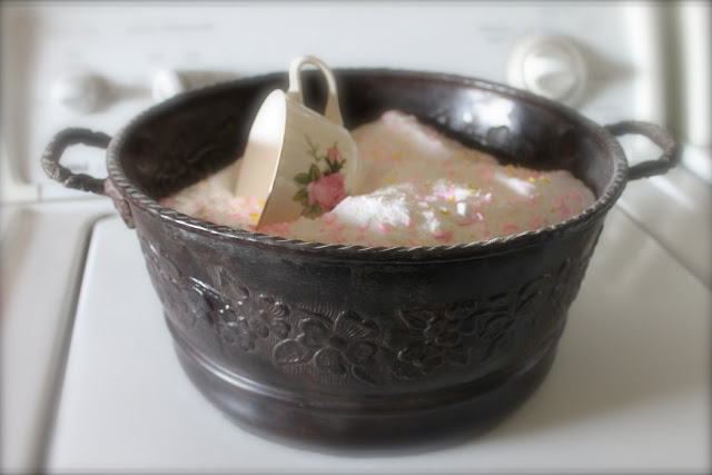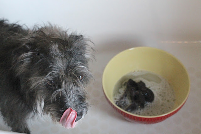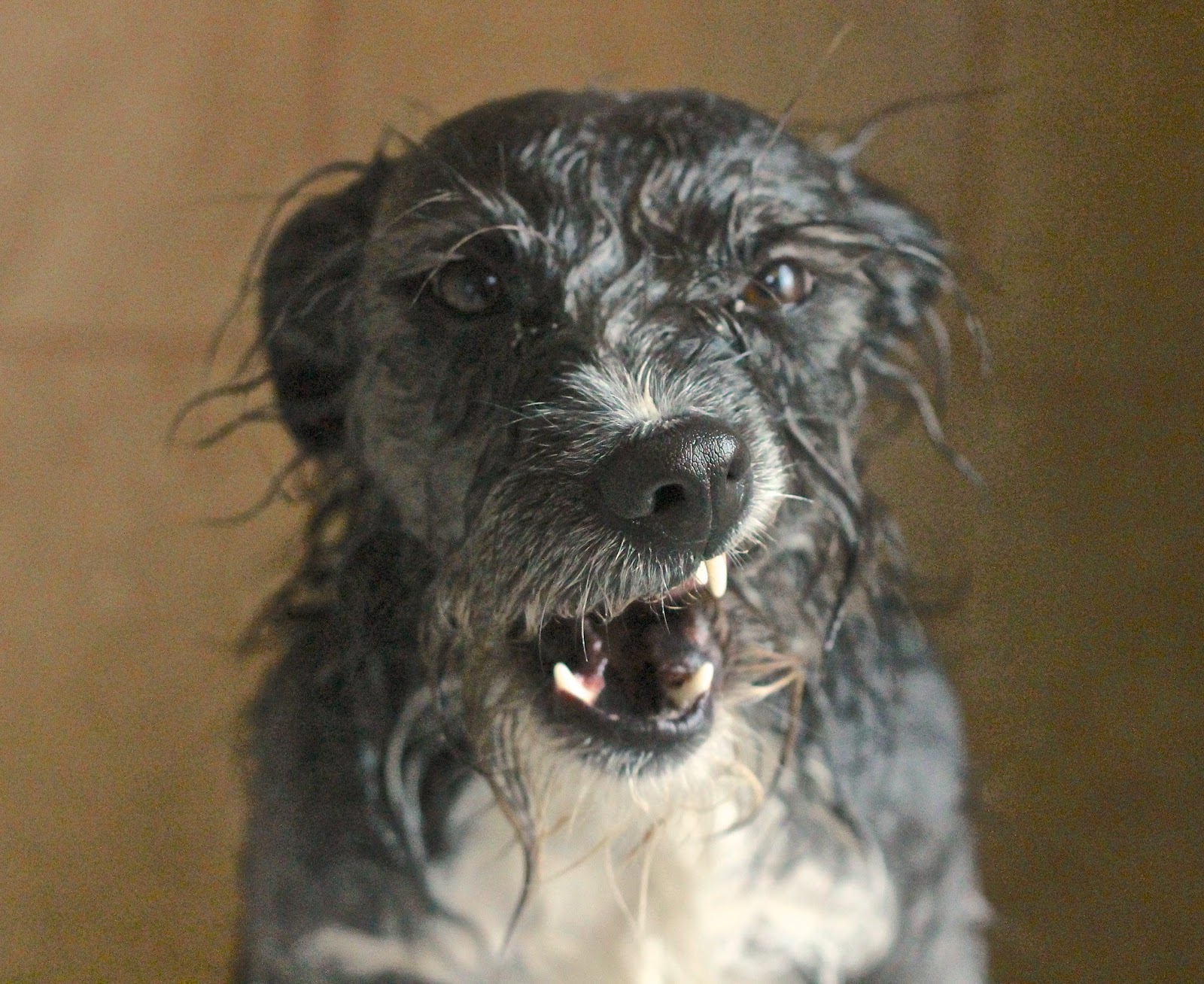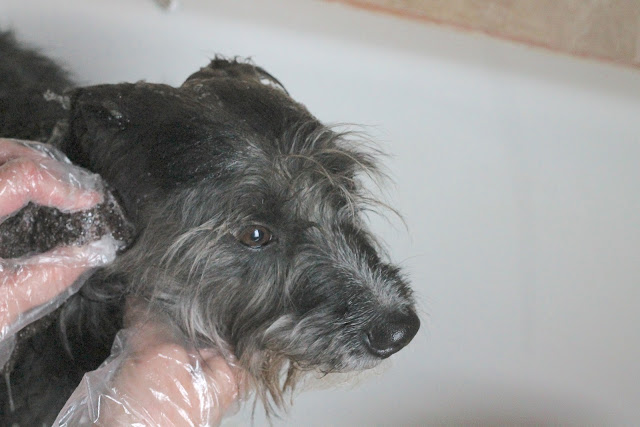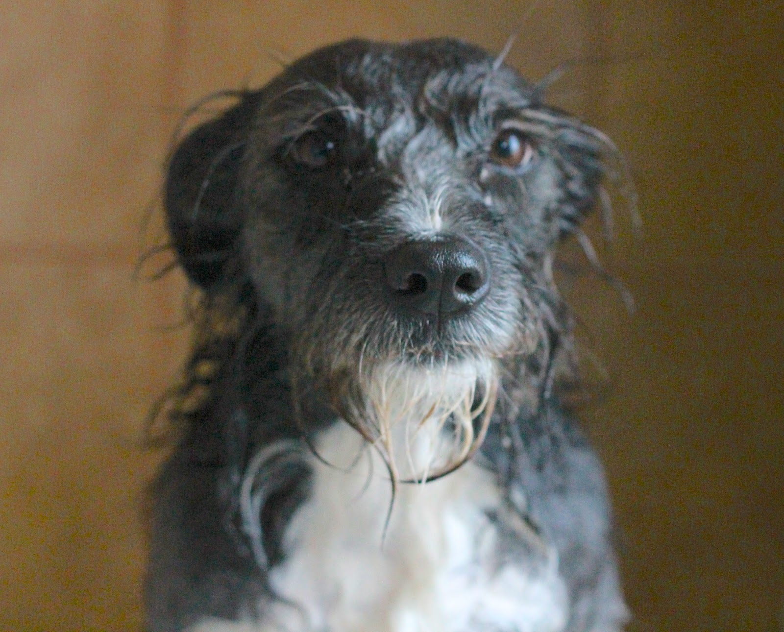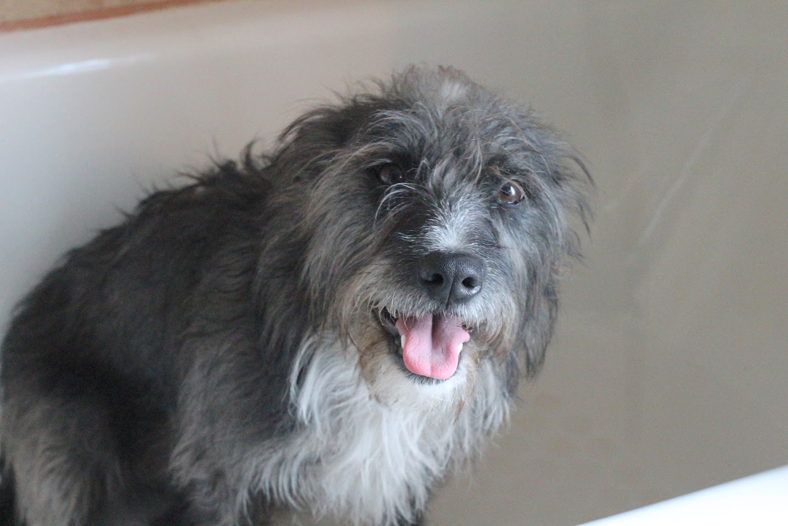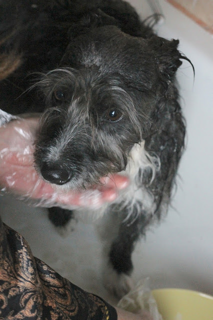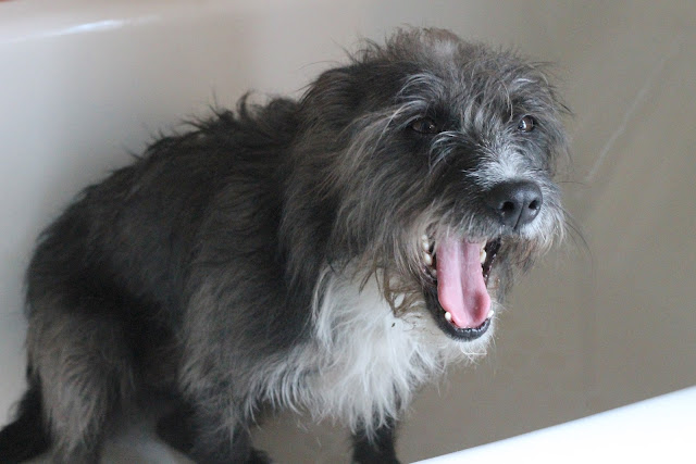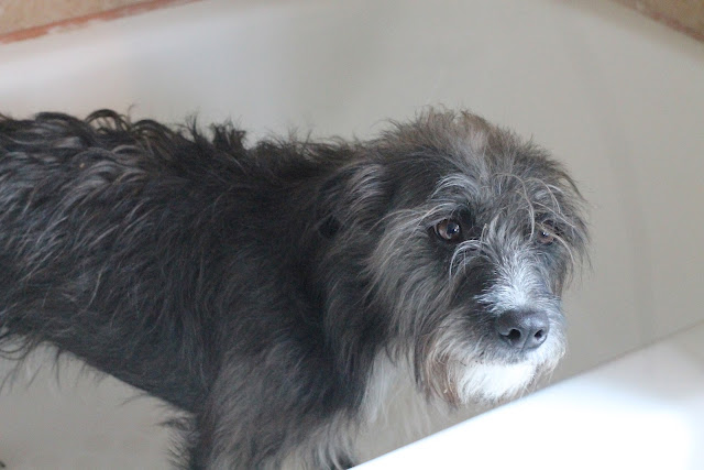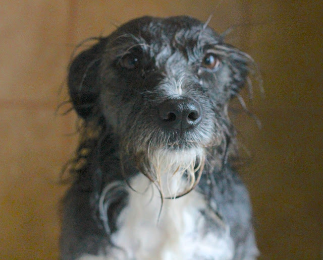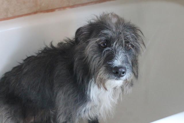 Shorty got skunked again this week. She averages 2 a year. Here she is in the tub; unhappily awaiting her bath. I have a good remedy that gets 99% of the skunk smell out. I will share it next post.