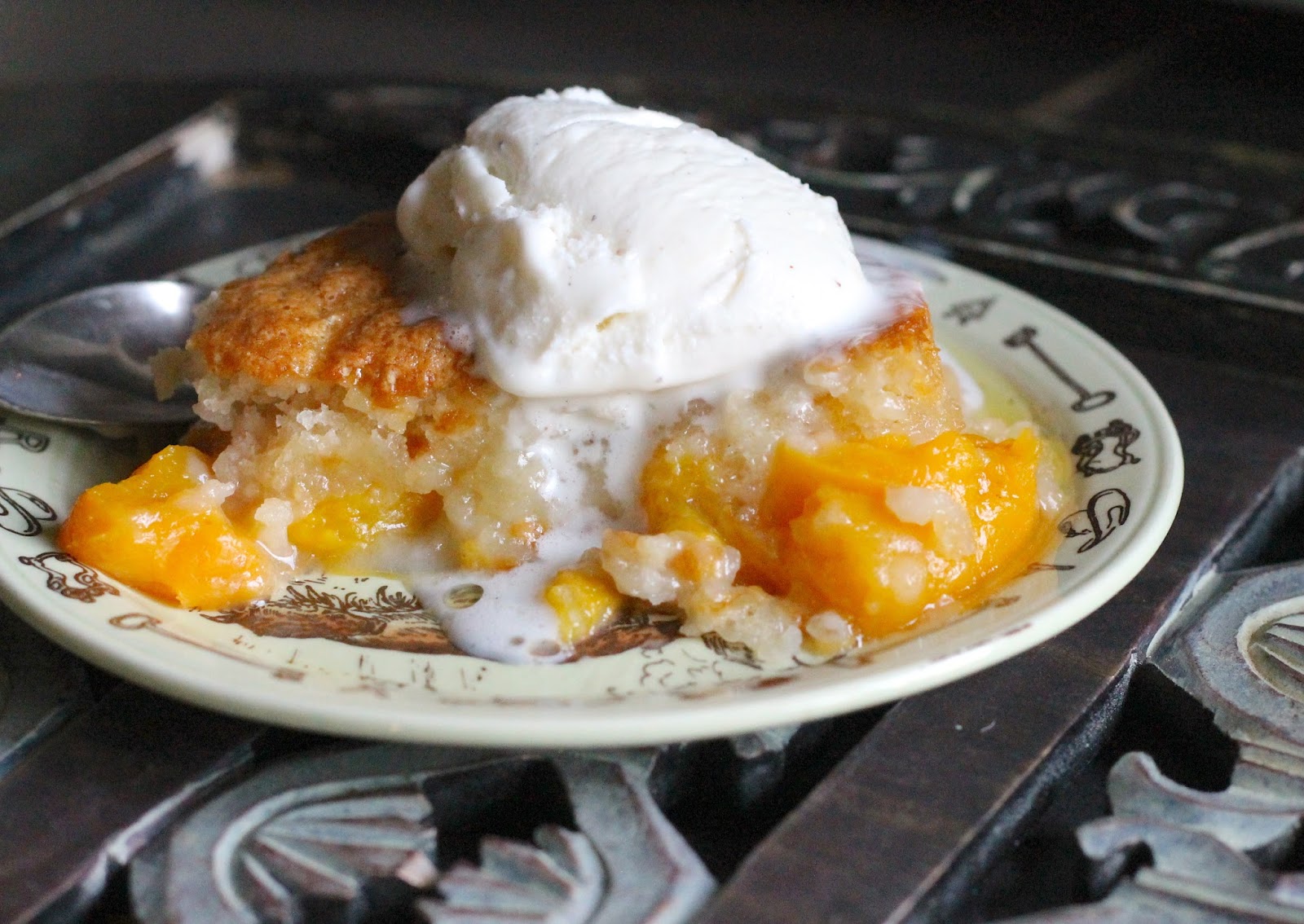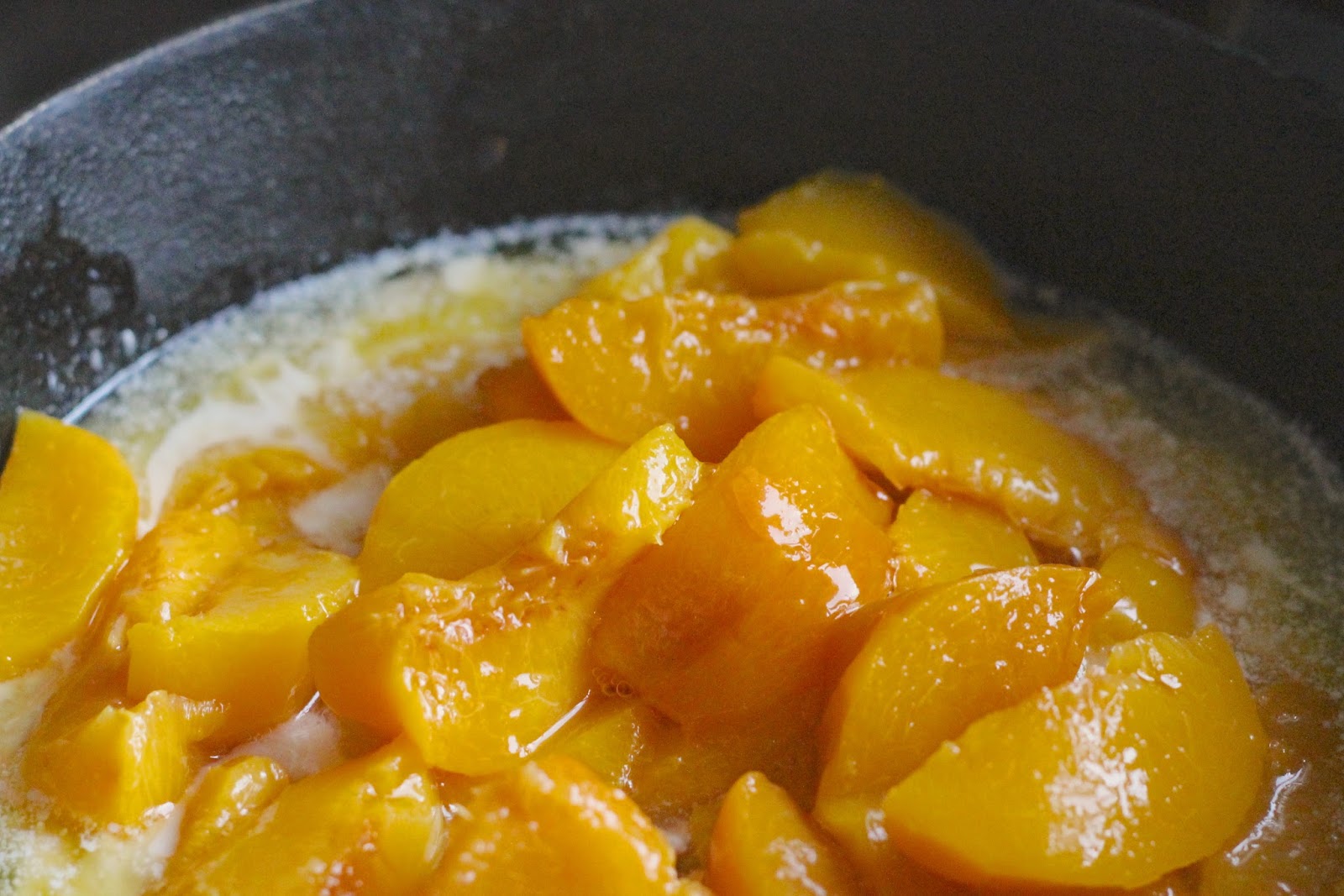 Preheat oven to 375 degrees fahrenheit.  Place the butter in a 10 to 12 inch cast iron skillet ( I have used a 9x9 inch square casserole pan and a 9x13... you can of course use these with a slightly different result... still yummy) Put into oven for two or three minutes until the butter is melted.   While that is melting, measure out your peaches and set aside.  Stir together all the dry ingredients in a medium sized mixing bowl.  Add milk and lemon juice whisk/mix together until well mixed.  Remove pan from oven and make sure the butter evenly coats entire pan.  Add half of the batter to the pan.  Add peaches on top.  Pour remaining batter over peaches (this batter will all rise to the top when cooking).  Bake for 45  minutes.  Serve warm with vanilla ice cream or whipped cream.