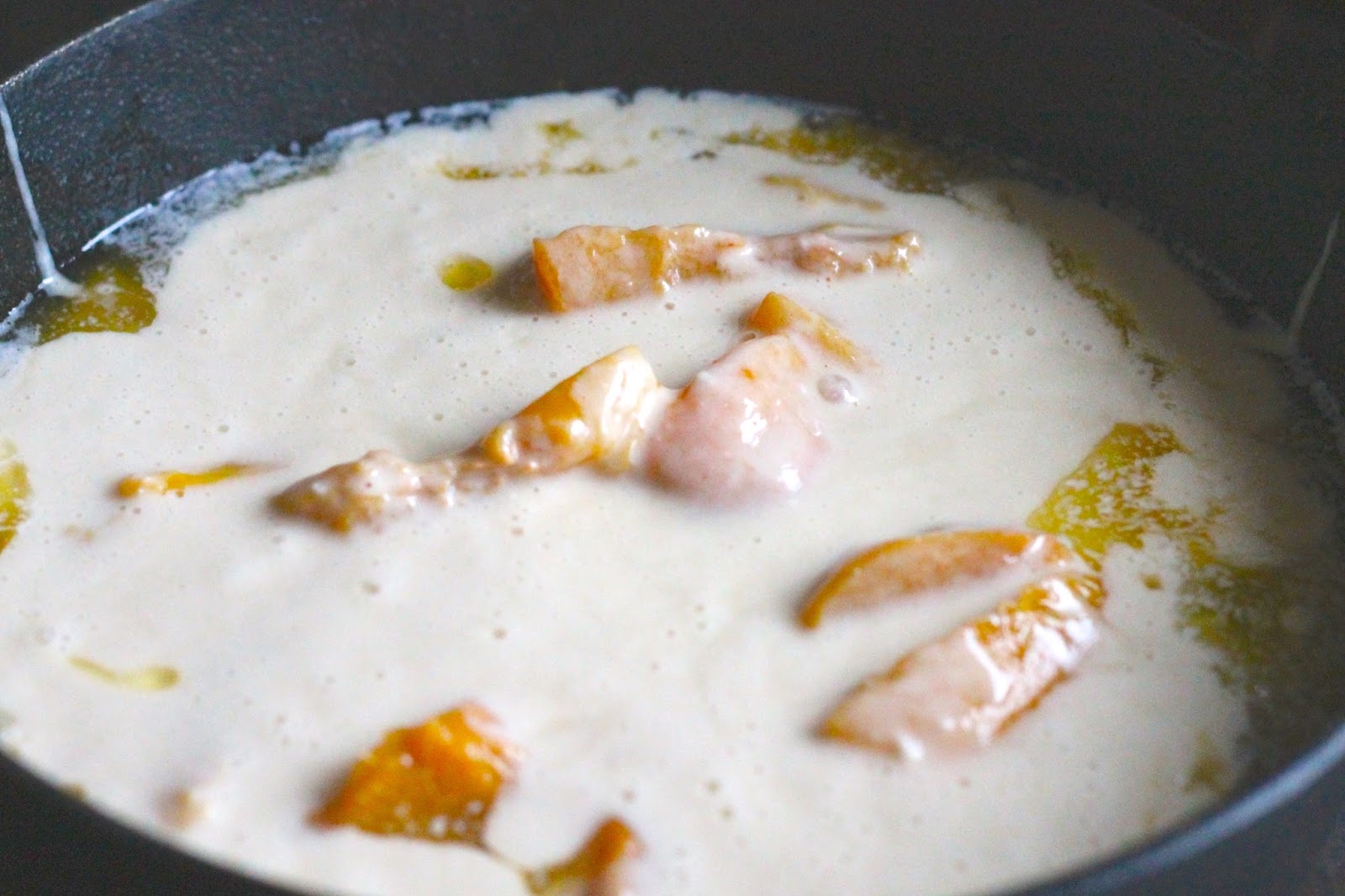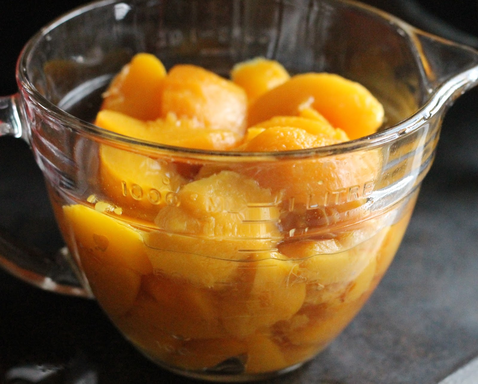 Measure out 4 cups fresh or canned peaches; skins removed.  Set to the side for a moment.