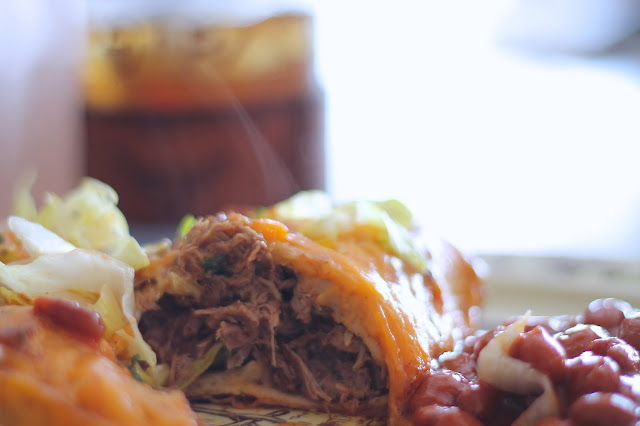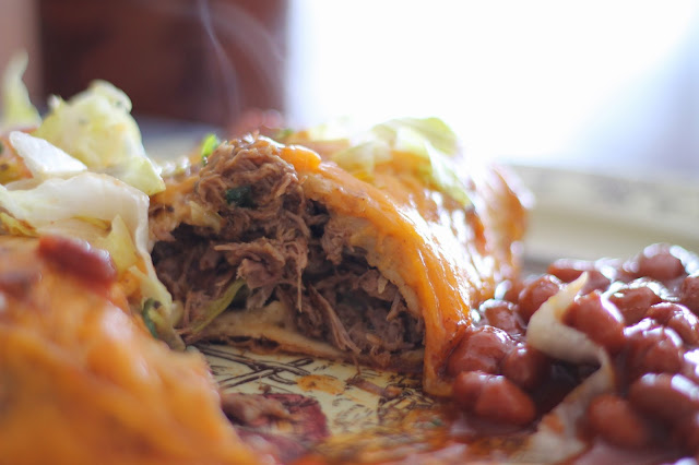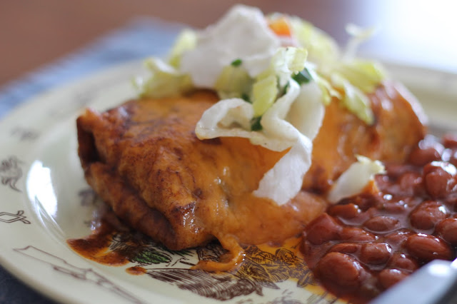 One of Steve's favorite meals is Shredded Beef Burritos Enchilada Style.  I have been making it for him ever since we were first married.  I used to work for a Mexican Food restaurant where one of their specialties was a Machaca Burro (Burrito), and it was a favorite of ours, so I learned how to make it.  I thought it would be a good recipe for Father's Day, and made it while my Dad was here as a sort of pre- Father's Day meal for him and Steve.  My husband is a beef lover, and this one is a great satisfier for a hungry man that wants some beef.   For a big crowd, or a large family meal, I often serve it together with a Chili Relleno Casserole.