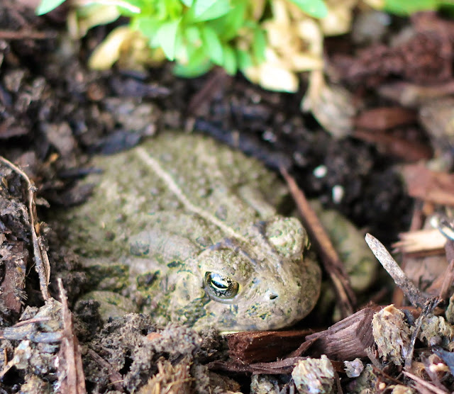 This is our toad.  We have had many toads as  I am sure many of you have toads, but this toad really likes us and insists on being near us all the time.  He can be found on our patio day or  night.  We had company coming to dinner the other day, so we kept putting him back in various places in the garden so that he wouldn't be underfoot and scare the company (some people aren't as fond of toads as I am).  We must have moved him 10 times... (a good deal away from the patio) but 5 minutes later he was back on the patio.  I didn't know toads knew their directions; this one does.
