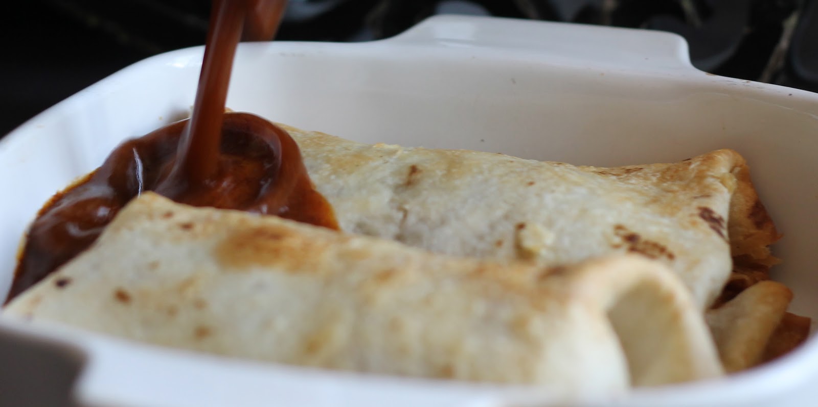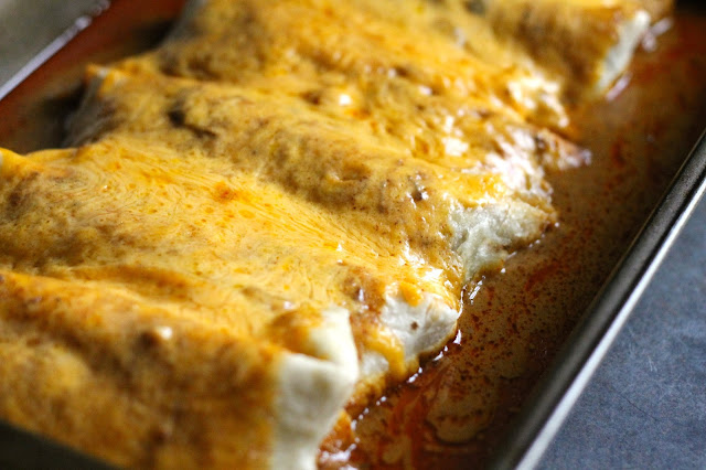 Stir the enchilada sauce into the beef...until it is thoroughly mixed and flavorful.