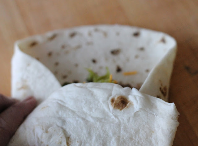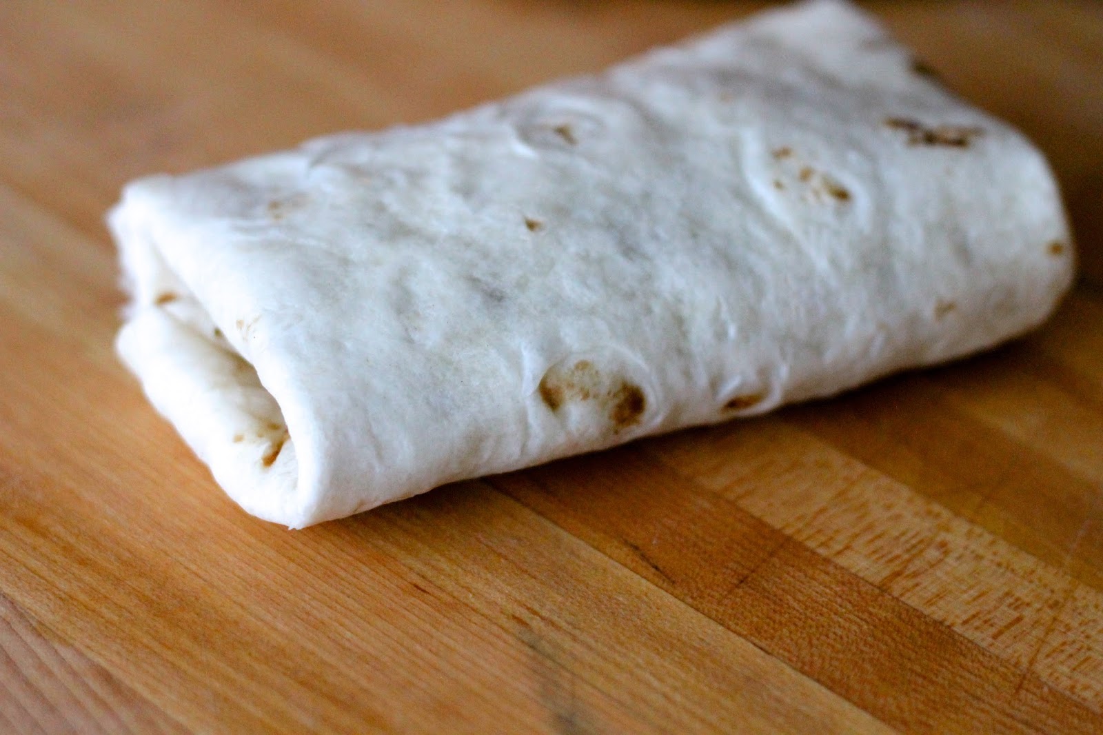 Take a tortilla and lay it flat. It is important to warm your tortillas so that they are pliable.