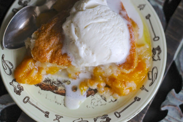 I got this Peach Cobbler recipe from my Mother in Law many years ago.  Its a classic to be sure, and I think its one of the best peach cobblers I've ever had.  My own addition to this recipe, is that I make it in a cast iron skillet, which for some reason just seems to cook it up perfect.  I have never tried to make a healthier version of this; I tell myself "somethings are best left alone";  but I have often thought of substituting the sugars for sucanat or another healthier sugar; the white flour for whole grain... just haven't ever gotten around to trying it.   It is made with pure, simple,  ingredients and love,  so it nourishes the emotionals in a way that only true comfort food can do... so there you go; its "health food"... ha ha.  It is also a very quick and easy dessert, so I love to cook it up for a special occasion or for company.  I am almost to the end of my home-canned peaches and before long, it will be time for another round of peach picking and canning.  This is a great peach recipe to suit that season.  I hope you enjoy it.