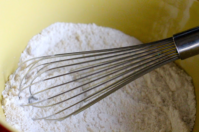 In a medium mixing bowl mix together 1 cup flour, 1 cup sugar, 1 Tb brown sugar, 1 tsp salt, and 3 tsp baking powder.