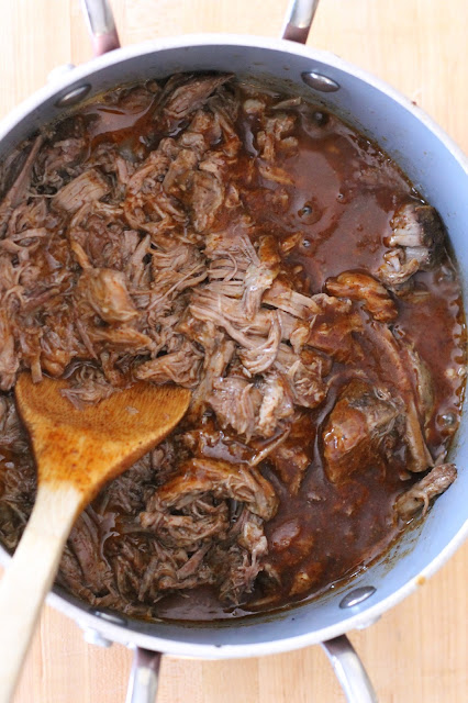 Add a cup or two of the sauce to your shredded beef.  This will vary according to the size of your roast.