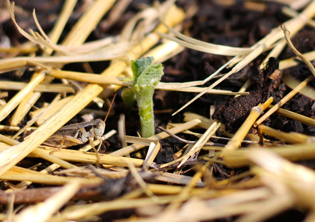 Can you see the grasshopper on the left side of the picture?  You might have to really look... its like one of those pictures "can you find Waldo"... haha.  He has just finished off the newly sprouted leaves of my zucchini squash.  He and his cousins are in the process of taking out our garden.  I have planted seed twice ... always hopeful that this time.... but everything that comes up they eat.  So far they have not started in on the strawberries and tomatoes and haven't been too hard on the onions.  We are trying to figure out what to do.  A hoop house is something we would like to do; but it isn't do-able right now.
