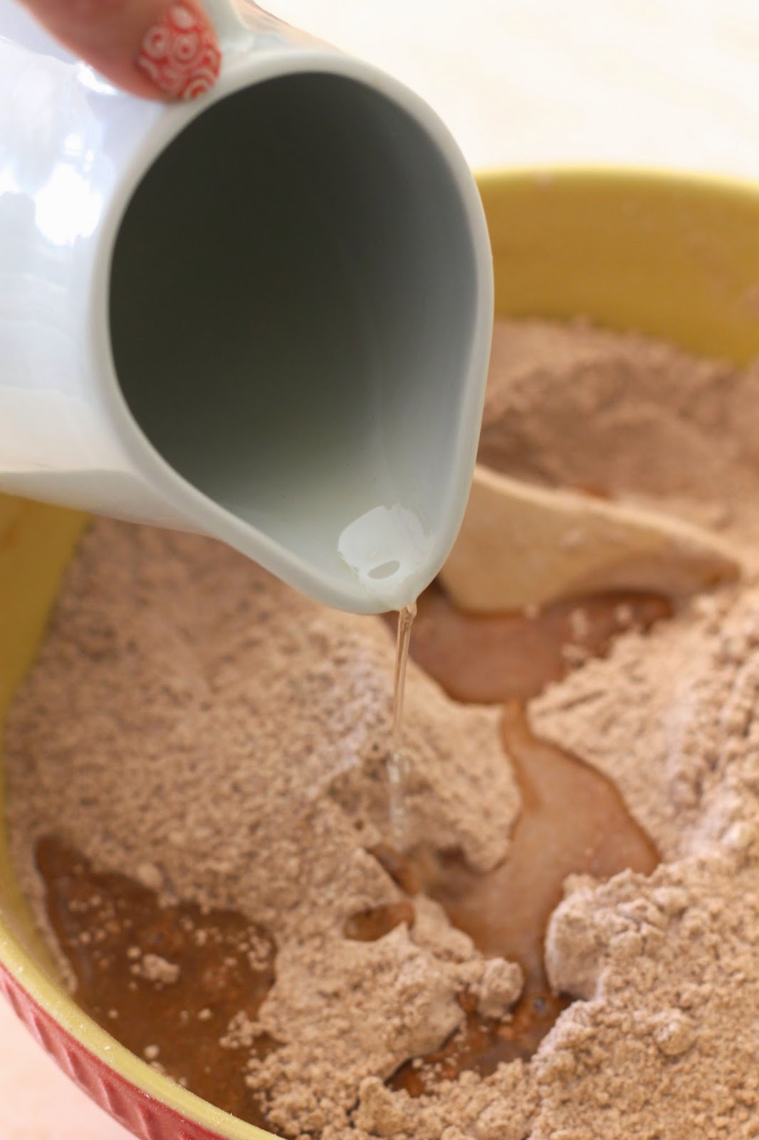 4. Pour water into flour and salt mixture, stirring as you pour. Mix until well blended, using just