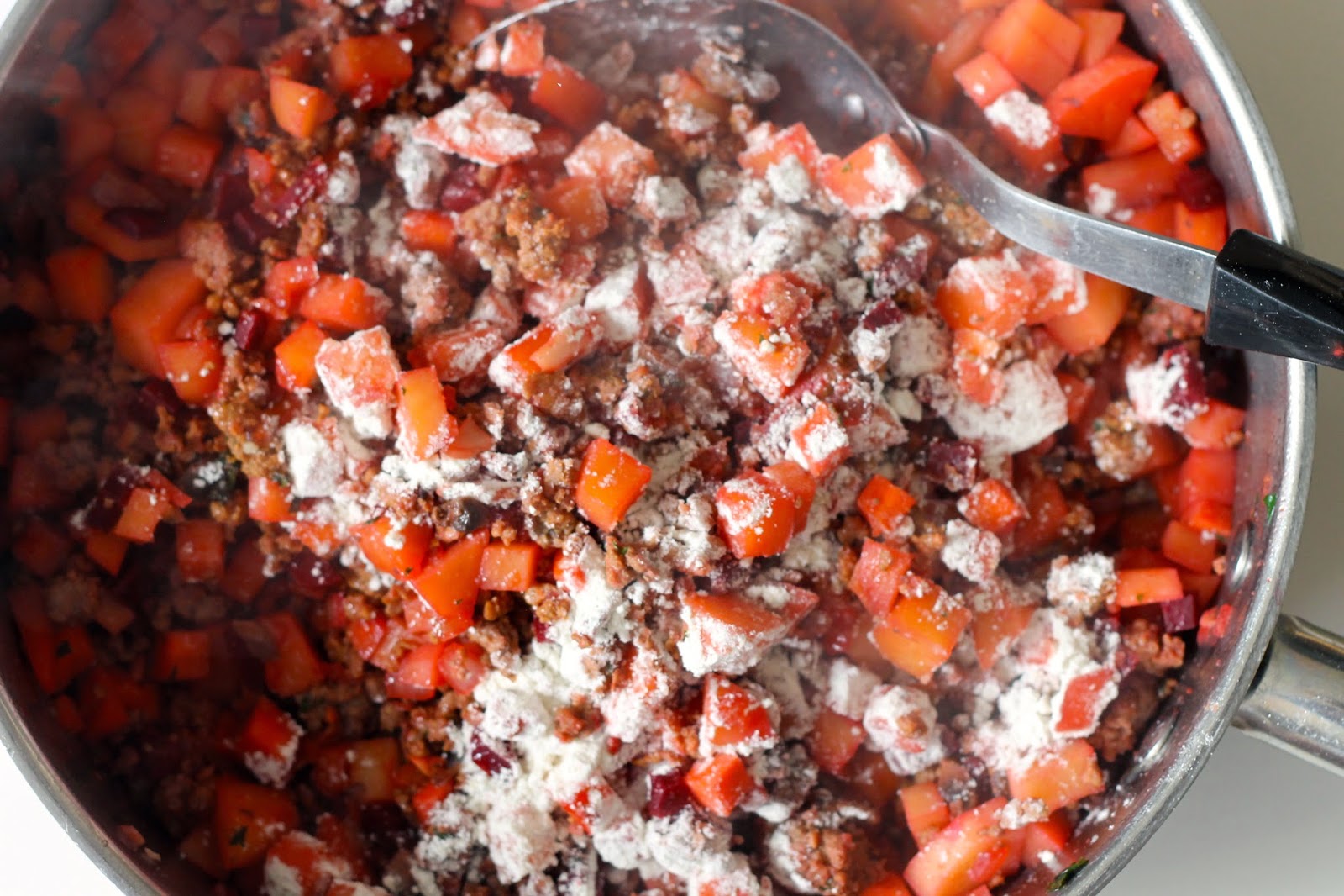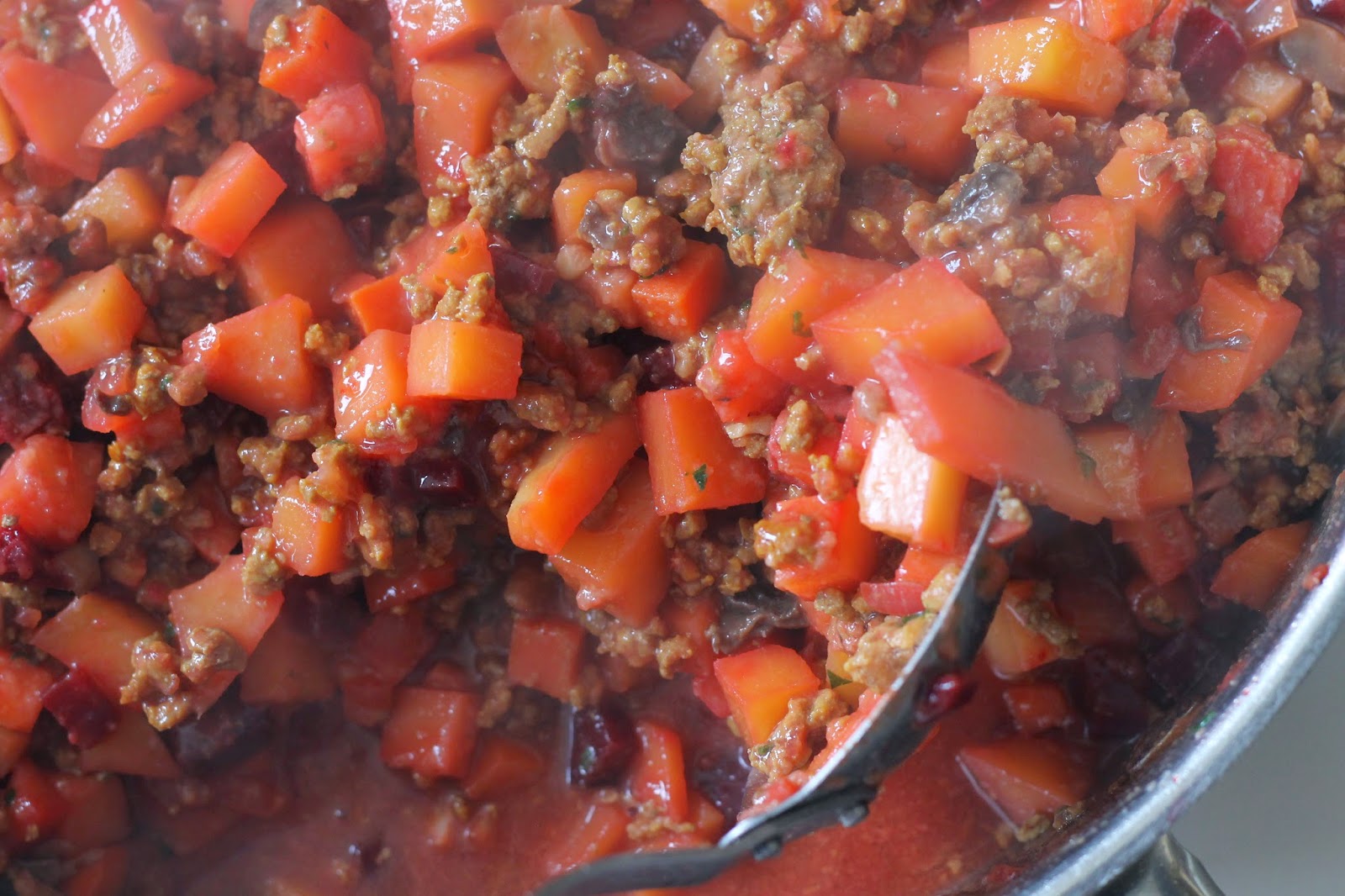 Saute until vegetables are beginning to get tender, and meat is cooked (I use a lean grass fed beef, so there is very little fat that cooks off of this beef. If you want to precook the beef, and drain the fat off before adding the vegetables, you could do it that way as well.)