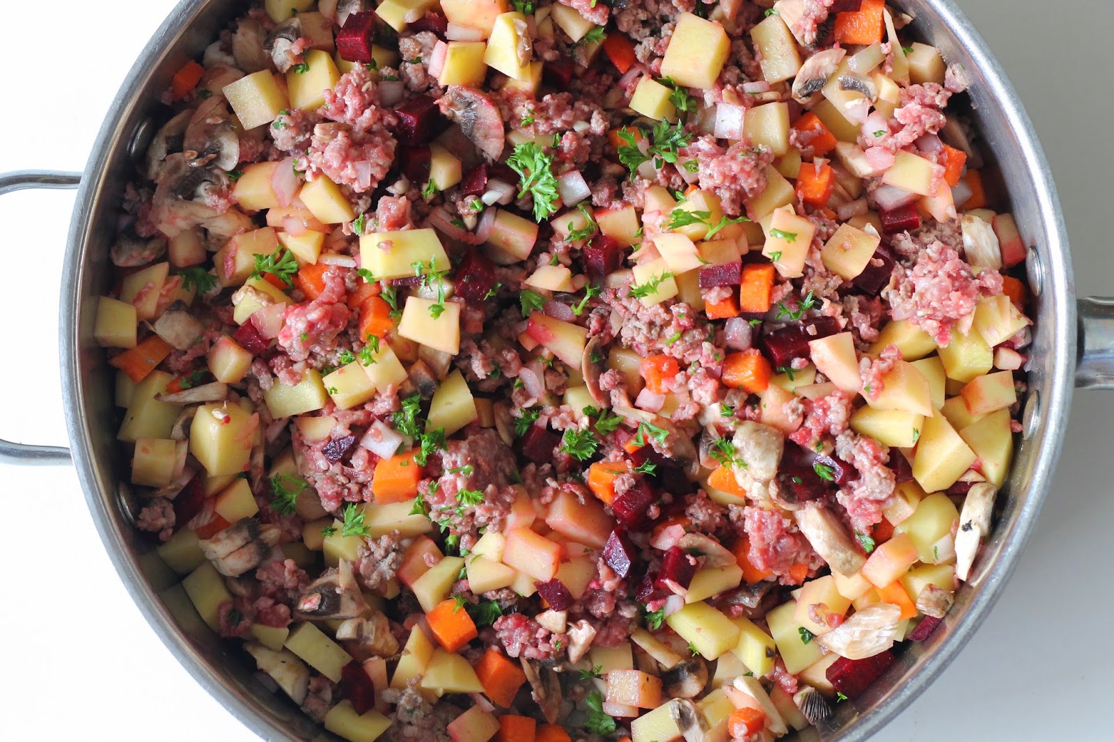 Peel and dice potatoes, beets, carrots and onions. Mince garlic and parsley and slice and chop mushrooms.